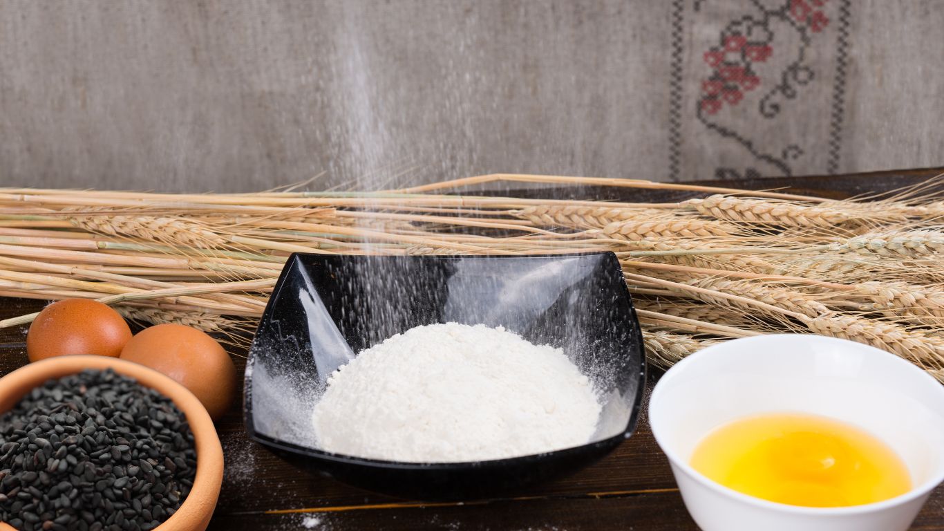 - Cho bột mì, mè đen, đường và muối vào âu trộn đều.