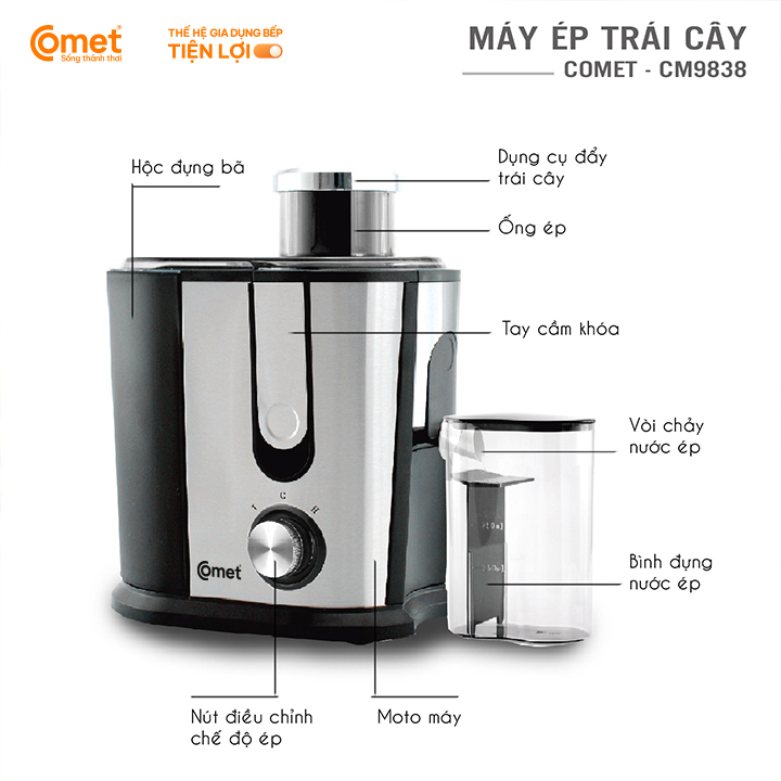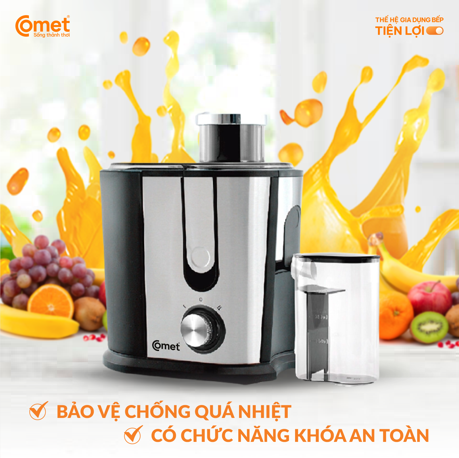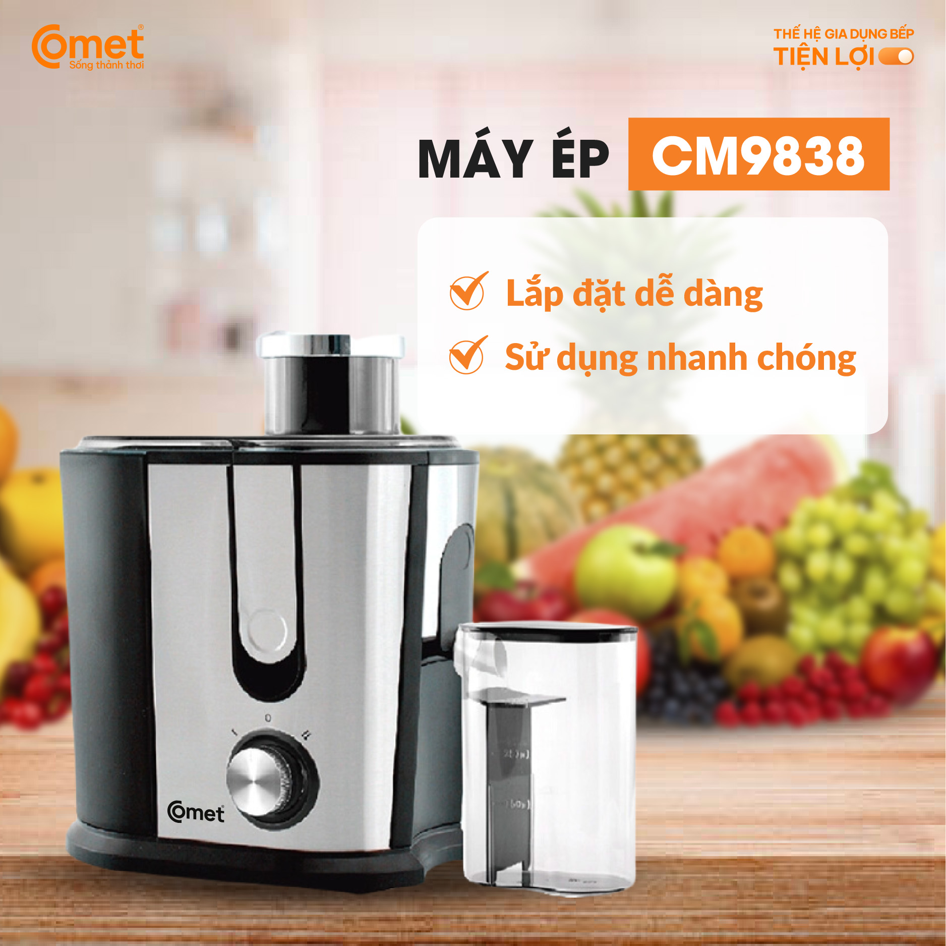 Máy ép trái cây Comet CM9838 với đường kính lớn (65 mm) có thể ép được cả trái táo hoặc lê một cách nhanh chóng mà không cần phải gọt vỏ. Động cơ của máy có công suất cao, lưỡi dao sắc bén giúp máy đạt hiệu suất cao, tiết kiệm thời gian, tiết kiệm năng lượng. Bên cạnh đó máy ép trái cây Comet CM9838 được bảo vệ chống quá nhiệt và có chức năng khóa an toàn, đảm bảo an toàn cho cả sản phẩm và người sử dụng.