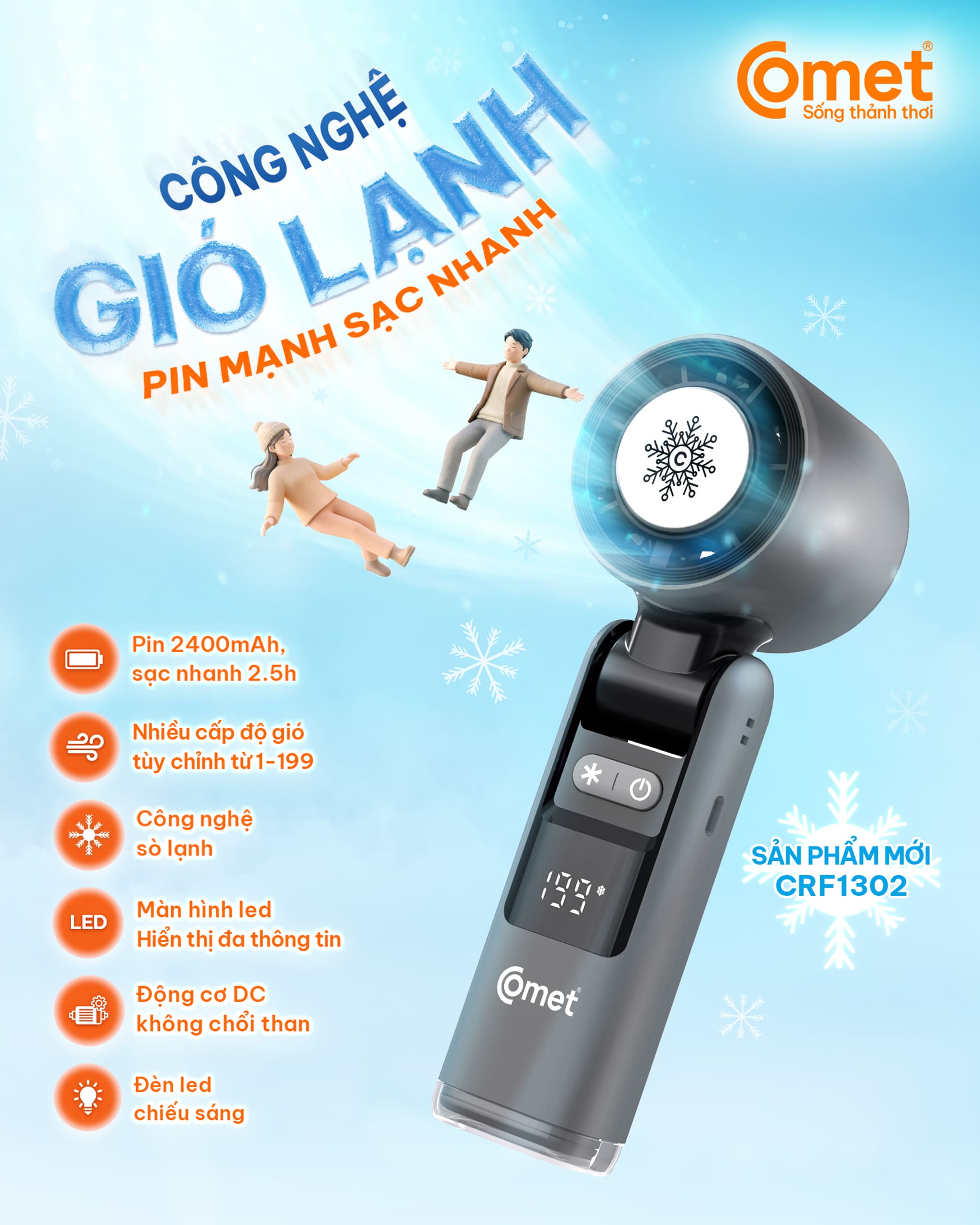 Quạt cầm tay Comet CRF1302 là sản phẩm mới ứng dụng công nghệ gió lạnh hiện đại, mang lại luồng gió mát sâu và dễ chịu tức thì. Trang bị pin 2400mAh, thời gian sạc nhanh chỉ 2.5 giờ, giúp sử dụng linh hoạt cả ngày dài.